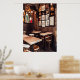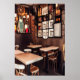 Innanför ett litet kafé, bord och stolar och dekoration på väggen. Det här är en AI-skapad konst.