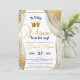 Träd in i en värld av kunglig förtrollning med vår 'En liten prins är på väg pojke baby shower inbjudan'. Denna utsökta design är en väv av kunglig sofistikering och tidlös charm, som perfekt fångar essensen av en fest värdig din lilla prins. I hjärtat av denna inbjudan glänser en praktfull guldkrona, prydd med invecklad detaljrikedom, med en aura av majestät och storhet. Det är en symbol för framtida kungadöme, en glimt av den lysande väg din lilla en dag kommer att beträda. Denna kungliga emblem lovar att din baby, även om den är ämnad för storhet, först kommer att omfamna den älskvärda titeln "lille prins". Runt kronan finns ömtåliga accenter, som glänsande stjärnor på natthimlen. Den rika, kungliga blå nyansen, som påminner om en midnatthimmel, genomsyrar designen med en aura av mystik och löfte. Det är en färg som symboliserar djup, adel och förväntan på ett storslaget äventyr. Med denna inbjudan sträcker du ut en kunglig välkomsthälsning till dina nära och kära, och ledsagar dem in i en händelse fylld av majestät och munterhet. Det är en introduktion till en fest som firar glädjen