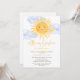 Planerar du en solig baby shower? Denna söta solskens-inbjudan till baby shower har texten "En liten solstråle är nästan här!" med en akvarell leende gul sol och moln. Perfekt för en könsneutral baby shower. Lätt att anpassa. Original Akvarell © Michele Davies.