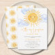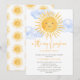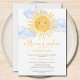 Planerar du en solig baby shower? Denna söta solskens-inbjudan till baby shower har texten "En liten solstråle är nästan här!" med en vattenfärgssminkad gul sol och moln. Baksidan är dekorerad med ett solmönster. Perfekt för en könsneutral baby shower. Lätt att anpassa. Original Vattenfärg © Michele Davies.