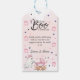 Tacka era gäster med stil med dessa söta presentkort till baby shower med texten "En liten Boo är snart förfallen". De här korten har samma charmiga design som inbjudan och är det perfekta sättet att lägga till en personlig touch på era partygavor. Korten visar en söt spöke som puttar en barnvagn, omgiven av mjuka rosa pumpor och stjärnor, allt på en mjuk rosa akvarellbakgrund. Det söta meddelandet "Tack för att ni firade med oss. Er kärlek och ert stöd betyder världen för oss!" gör dem till en hjärtlig souvenir för era gäster. Dessa anpassningsbara kort kommer med förhålade hål och är perfekta för en höst- eller Halloween-tematisk baby shower.