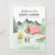 En första födelsedagsinbjudan till Lycklig Camper med vattenfärgscampingplats. Konstruktionen har ett landningsläger med tält, campfire, smores och bergsskog.