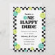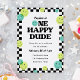En roligt och en lysande 1:a födelsedamitbjudan med grönt och akva som leende ansikte-ikoner och svart utcheckad gräns. "En lycklig-kille" är i en groovy, ett retro-typsnitt. Om ni vill ändra den här texten, kontakta mig så kommer jag att göra uppdateringar utan kostnad för extra. Kortets baksida har en gult och ett vitt styrt mönster som kostymer reflexen.