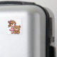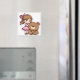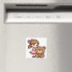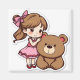 Bild på magnet: en tjej med liten björn. I form av ett klistermärke från en stor samling. På vit bakgrund.