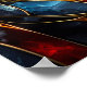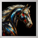 En sidovy porträtt av en bedövande häst i abstrakt stil. Den här teckningen har en glasteknik för konstnärlig nedfläckad med guldfärgat linjer, fylld med pulverröd, blå, orange, svart och silver mot mörkens bakgrund. Resultatet är en stor skildring av en hingst som uteslutit regal splendor.
