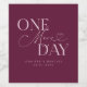Minimalistisk bröllop-repetitionsmiddag vin flaska med typografiktext som säger "ytterligare en dag". Bakgrunden är kranbär.