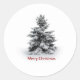Runddekal med en bild av en solitär snö-täckt gräs träd och "God jul" tryckt under den i rött. Se matcha kontur, favärde-tagg, presentsäckar, etikett och omslagning pappert. Visa hela samlingen med Helgdag Sticker i INBJUDAN | Avsnittet Stickers & Labels.