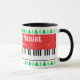 Grand piano nycklar jul mugg för en pianospelare, pianist, student, lärare, musiker, instruktör, barn, vänner osv. Svart och vit piano nycklar och snöflingor på rött rand, Julgran överst och grund, med elegantens manus "One Merry Pianist!". Vinterpresentidé om Helgdag för honom eller henne i elegant personlig.
