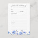 Kort för tomma recept för gästerna för att ett favoritrecept med bruden att vara. Receptkortet är personlig på baksidan och dekorerat med vattenfärgen blommigt gräns i söt blåa blommor. Denna ömtåliga trädgårdskonstruktion i blått och vitt är perfekt för blått möhippa, botaniskt och trädgårdsmässigt tema eller vår eller sommartid. Om du vill koordinera inbjudningar, kontorsprogram och händelsemedjare kan du bläddra i min "Någonting Blue Blommigt Möhippa Collection" eller meddela mig om du vill lägga till ytterligare objekt som du behöver.