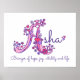 Söt A monogramkonst namn poster perfekt för ett flickors sovrum eller lekrum i nyans, rosa och lila. Personalisera med ditt barns egen namn från och med A, och namn, vilket betyder att du får en verkligt personlig kontakt med ditt barns sovrum eller daghem, är detta exempel för namn A Asha Bringer av hopp, glädje, livskraft och liv. Cute poster utskrift som passar perfekt för en nyfödd bebis-, ristening- eller babyduschpresent. © Unik A monogram-hjärtan och blommor teckning beskrivning och grafisk konsdesign av Sarah Trett. www.sarahtrett.com för www.mylittleeden.com