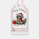 En festlig kapplöpning, som bär en röd julhatt och scarf, sparar en cookie nära ett ångande mugg. Den här märkrn är retad med fromma helgdag och fångar julglädjens anda.