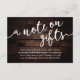 Fira början på er resa tillsammans med vår elegant rustika moderna stuga mörkt träd bakgrundstema, medföljande "Ett meddelande om gåvor" bröllopsinbjudan kort, önskan, kontanter. Med en sofistikerad blandning av modernt manus och romantisk allure är varje kort noggrant utformat för att förmedla essensen av er speciella dag. Perfekt för par som söker ett unikt sätt att dela sina drömmar om smekmånad, detta kort inbjuder era nära och kära att bidra till oförglömliga upplevelser. Oavsett om det är placerat i ett lyxigt kuvert eller presenteras tillsammans med era bröllopsinbjudningar, tillför vårt kort en touch av förtrollning till er fest, och lovar minnen som varar livet ut. Designad av TeeshaDerr