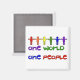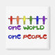 Regnbåge figurer länkar samman arm och står på ord: "One World One People" för att få ut budskapet att världsfreden börjar med oss. Vi måste komma överens med varandra innan vi kan få fred.
