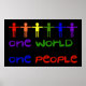 Regnbåge figurer länkar samman arm och står på ord: "One World One People" för att få ut budskapet att världsfreden börjar med oss. Vi måste komma överens med varandra innan vi kan få fred.