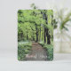 Ett vackert tackkort med en vår-skog med lätt dans genom träd och en matta med vita blommor.