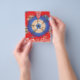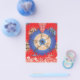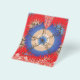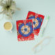 Utformningen har en fantastisk fraktal mönster. I mitten finns ett cirkulärt motiv i blått och vitt, omgivet av intrikat mönster i orange, brunt och blått. Bakgrunden är en röd rik med guld star-liknande mönster som är spridd över hela världen. Denna symmetriska fraktaldesign är synligt fängslande och symboliserar ofta oändlig komplexitet, oavsett om det gäller matematik, natur eller konst.