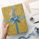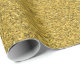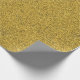 en rulle gul glittrig presentpapper delvis upprullad för att visa den gnistrande texturen och den krulliga kanten, mot en ren vit bakgrund