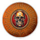 En skalle vars närvaro inspirerar både glöd och fascination. Dess skalle kännetecknas av tid, med en strålande skatt i dess centrum, en gemen som pulserar med skakande färg och håller liv och död i hemlighet. Skallens öga-socklar ser ut som två glödande kolvar, klarrött och piercing, som om de kunde se själens djupaste hemligheter. En andedräkt av filigree löv, vars grönt veniner kontrasterar med blekens ben. Denna levande omfamning symboliserar den eviga liv- och dödscykeln, medan en konstgjort skapad kedja omger den - ett tecken på den oskiljaktiga kopplingen mellan världen.