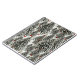 Bärbar dator i en skog med snö täckt Julgranar, i svartvitt och grått, med spridning av lite rött paket