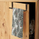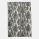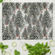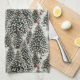Kökshandduk i en skog av snö täckt Julgranar, i svartvitt och grått, med spridning av lite rött paket