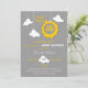 Denna moderna och färgglada inbjudan är ideal för att fira en Baby Shower med en solsken, “You are my Sunshine”, “My Little Sunshine” eller “A Little Ray of Sunshine” tema. Den har en utskuren sol med söta moln som hänger från toppen på en grå bakgrund. Denna design är bra för sommaren och året runt. Unisexdesign. Färgglad och lekfull design som en chic mamma kommer att uppskatta.