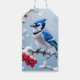 En Söt Blue Jay på en Snowy Gren-jul Presentetikett