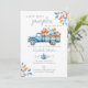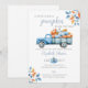 Denna stilrena baby shower-inbjudan har en rustik höstkänsla med höstlöv och en söt blå lastbil full av pumpor. Designad av Thisisnotme