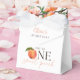 Dessa charmiga presentförpackningar för första födelsedagsfesten har persikor och blomvattenfärg i vattenfärg, tillsammans med elegant typsnitt i script. Designad av Thisisnotme