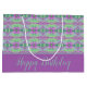 Anpassa texten från grattis på födelsedagen på denna vackra blomsterformade presentpåse till kostym, vem som helst eller vid något särskilt tillfälle, lila bakgrund och rand kan växlas till vilken färg som helst till kostym i ert eget stil, och all inslag kan tas bort. Färg är grönt, teal, kalk, lila och mauve.