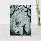 En spindel, en häxa och en skogstävling i stencilstil är en design för Halloween. En ensam häxa i skogen med sina bästa vänner: en tam räv och en kuslig spindel som hänger framför ett spindelnät, En kuslig silhuett för alla ghoular eller boo!
