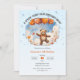 En halloween-inbjudan för pojkar. Det finns en förtjusande nalle som flyter i himmel med pumpballonger genom en virrvarr av höst löv. Den blå bakgrunden i himmel är fylld med glasögon och stjärnor. Det är perfektens inbjudan att fira en liten pojkfödelsedag, särskilt när den vackra frasen ovan lyder "A Spook-Teddy-ular Birthday Bash!"