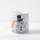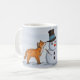 En kardinal på en träd gren vakter på när en räv utreder ett snögubbe som lämnats efter av några barn på en kall vinter morse.
