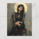 Underbart kvinna sitta på en avföringsbricka klädd i svart med en gyllene cirkel bakom henne