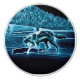 En ensam varg (Canis lupus) färdas genom ett snölandskap i den här enkla, mörk och stiliserade bilden. Moonlight reflekterar utanför snö.