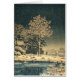 En vinterdag på Sumida-floden i Japan av Tsuchiya Koitsu - Den stora vintern luft hängde tungt över Sumida-flodens banker. Snö, en pristinvit täckt täckte ljud i den begravande staden. En ensam figur, en kvinna i ett sjudande kimono, hennes ansikte, fördunklad av ett traditionellt paraply, skyndade sig längs en snö-dammad väg. Hennes destination: ett quaint trähus i närheten av Suijin Skogen. — Den här scenen, ett mästerverk av den berömda konstnären Tsuchiya Koitsu, fångar kärnan av en gammal epok i ett snabbt föränderligt Japan. Ett mäktigt träd, dess grenar tungt med snö, står indikatorn i centrum, dess reflektion som skakar på en närliggande damm vid vatten. Sumidafloden, ett tyst vittne till tidens gång, går genom bilden. — På den lämnat stranden vid Sumida-floden nära Suijin Skogen råder det stor lugn. Kvinnans närvaro, hennes färgstarka kimono är en skarp kontrast till vinterns muterade toner, antyder ett liv som genomsyras av tradition. Rökning från skorsten av det gamla huset, som delvis skymts av träd, talar om värme och ett enklare levnadssätt. — Över floden, till högerna, utvecklas en annan historia. Byggnad, obönhörligt och industriellt, viker horisonten i avstånd. Rökbilar från deras skorsten, ett testamente till den obevekliga framstegsmarsch. Här målar konstnären ett bild i ett nytt Japan, ett som drivs av hjul inom industrin. — Det centrala träd fungerar som en kraftfull metafor, där dess snö-lastade boughs skiljer det gamla från det nya. Ändå är det inte fråga om en grym delning. Kvinnan, som fångas mellan de två världar, förkroppsligar hoppet om en harmonisk samexistens. Kanske är hon en bro mellan det förflutna och framtiden, ett bevis på den bestående traditionsandan även i ansikte av förändring. — Tsuchiya Koitsus mästerliga använda av färg förstärker berättarrösten. De blå blyorna i vatten väcker en känsla av lugn, medan gråtoner och vita i snö och himlar skapar en fredlig vinteratmosfär. Kvinnans livliga kimono, stänk i färg mot den muterade bakgrunden, understryker traditionens bestående kraft. — "En vinterdag på Sumida River i Japan" är mer än bara ett landskap; det är en flagrant reflektion över en nation i flöde. Det är en påminnelse om det förflutnas skönhet, den obevekliga framstegsmarschen och det bestående hoppet om en framtid som omfattar båda. — Denna 1949 års teckning av Tsuchiya Koitsu (1870-1949) är offentlig i land i ursprung och andra land och i områden där upphovsrätten är upphovsmannens livstid plus 70 år eller mindre.