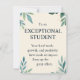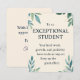 Exceptional Student är ett hjärtligt tackkort designat för lärare som vill uppmärksamma och fira elevernas prestationer. Med en mjuk botanisk akvarelldesign med gröna blad och subtila gyllene fläckar på en varm beige bakgrund förmedlar detta kort ett budskap om uppmuntran och positivitet. Den universella formuleringen gör det lämpligt för studenter i alla åldrar och bakgrunder. Oavsett om det används i klassrum, examensceremonier eller personliga erkännanden, hjälper detta eleganta kort lärare att uttrycka tacksamhet och inspirera till fortsatt utveckling.