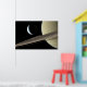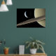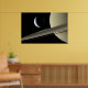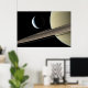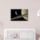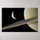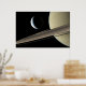 Digital grafik som skildrar Saturnus och måne, Enceladus Enceladus är hem för många geyers som tillför material till det bleka "E" Ring. Även Prometheus och Pandora syns i förgrunden. Prometheus springa längs insidan av "F" ring och fungerar som en "shepherd" som håller F ring intakt.