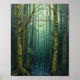 This evocative piece, "Enchanted Emerald Sanctuary," is a stunning oil painting that captures the quiet, mysterious beauty of a deep, watery forest. The viewer is drawn into a mesmerizing scene dominated by towering, slender tree trunks that stretch toward a light-dappled canopy, creating an ethereal sense of height and seclusion.