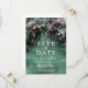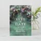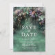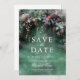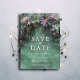 En vit vattenfärgsillustration av lush foliage in emerald grönt med lavender- och lilac-nyanser, mousserande med fairy ljus och magiskt stoft, dekorerar sommarfall quinceanera i vår från att spara inbjudan med ett förtrollat skogstema. En elegant, modern räddar datumet för ett sagolikt firande. Perfekt för flickor som kärlek den sagda skogsmiljön, mjölskogen eller trädgårdstemat och som framkallar grönt med en aning lavendellila.