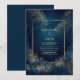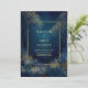 Set the stage for a magical evening with this ethereal forest landscape. The deep midnight blue backdrop is filled with shimmering starlight, casting a soft glow over a serene woodland scene. Majestic, slender trees and lush, glowing bushes sparkle with intense golden bokeh lights, creating a sense of wonder and romantic mystery. Framed by a sleek, rounded gold border, the composition captures the quiet majesty of a moonlit grove. This atmospheric piece is perfect for couples wanting a high-drama, luxury aesthetic that feels both organic and otherworldly. This is a wedding invitation designed for formal evening ceremonies, enchanted forest celebrations, or starlit winter solstice events.