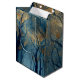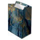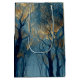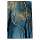 A highly stylized and magical vertical illustration or digital painting of a dense winter forest at twilight. The scene is dominated by tall, dark blue and black stylized tree trunks with bare, intricately detailed branches. The upper branches are covered in a shimmering, glowing golden light and texture, creating the impression of being coated in gold leaf or fairy dust. The overall color palette is a dramatic contrast of deep blues, navy, and turquoise against bright gold, suggesting an ethereal, enchanted, and slightly cold atmosphere, possibly from a fantasy novel or mystical winter tale.
