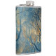 A highly stylized and magical vertical illustration or digital painting of a dense winter forest at twilight. The scene is dominated by tall, dark blue and black stylized tree trunks with bare, intricately detailed branches. The upper branches are covered in a shimmering, glowing golden light and texture, creating the impression of being coated in gold leaf or fairy dust. The overall color palette is a dramatic contrast of deep blues, navy, and turquoise against bright gold, suggesting an ethereal, enchanted, and slightly cold atmosphere, possibly from a fantasy novel or mystical winter tale.