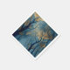 A highly stylized and magical vertical illustration or digital painting of a dense winter forest at twilight. The scene is dominated by tall, dark blue and black stylized tree trunks with bare, intricately detailed branches. The upper branches are covered in a shimmering, glowing golden light and texture, creating the impression of being coated in gold leaf or fairy dust. The overall color palette is a dramatic contrast of deep blues, navy, and turquoise against bright gold, suggesting an ethereal, enchanted, and slightly cold atmosphere, possibly from a fantasy novel or mystical winter tale.
