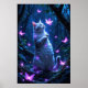A fluffy tabby kitten sits in a magical forest at night, surrounded by many glowing purple butterflies, with soft light emanating from them. Clear details and vibrant colors enhance visual appeal.