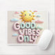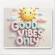 Pastel-färgad bubble brev: GOOD VIBES ENDAST. Ovanför texten, en leende tecknad sol, med gnistor och små moln runt. Mjuka toner på vitt. En solskyddspackad design till hiss i rummet.