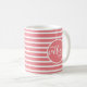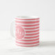 Börja din dag med positiva tankar! Cute modern design med "Endast bra vibration" motiverande bekräftelsecitat i vit text på vår stiliga korall- och vitrandiga kaffekopp. Designen är synlig för höger- och vänsterhäntanvändning med orden synliga från båda sidor.