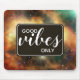 Endast bra vibrationer! Genomtänkt bekräftelse uppmuntrar medvetet motivation och inspiration under tuffa tider och fungerar som en påminnelse för att skifta till en positiv sinnesstämning. Endast bra vibrationer uppbygglig Citat-design har en trendig skript- och kalligrafidesign med vit text presenterad med en ramad mörk rundad rektangel på ett rymdfoto av en stjärnig galax i universum som bakgrund.