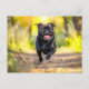 pug running energetically through a forest, showcasing its playful and adventurous spirit