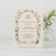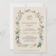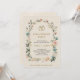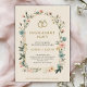 Engagemangspartyns inbjudan med blomsterkant och guldringar högst upp med elegant text. Baksidan är slät med ett subtilt strukturerat mönster. Mjuk, festlig ton.
