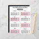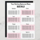 Hjälp dig och dina kunder att förbli säkra. Använda den här temporära menyn som är tillgänglig. Lägg till menyalternativ och restauranginformation. Lägg till ett foto på motsatt sida om du vill. Detta kan också vara en bipacksedel för dina kunder om du levererar hemma. Behålla information om livsmedelsalternativ kort. Kunden kan ta med sig det här hem, så det fungerar som ett affärskort också. Det här är rosa och vitt. En del av reglerna för återöppning är engångmenyer, använda den här mallen för att anpassa menyn för återöppnandet av restaurangen. Om du behöver hjälp med att anpassa det här kontaktar du designern., Ingen minsta beställning.